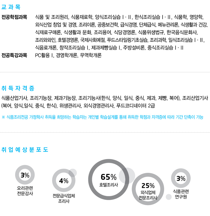 4년제 대학편입(식품영양학과, 식품조리학과, 식품가공학과, 외식경영학과 등) 및 대학원 진학, 전통음식문화 연구원, Cooking School 강사 )
