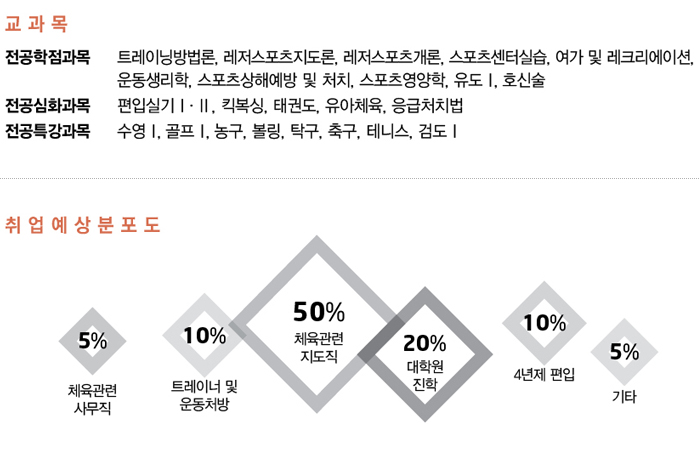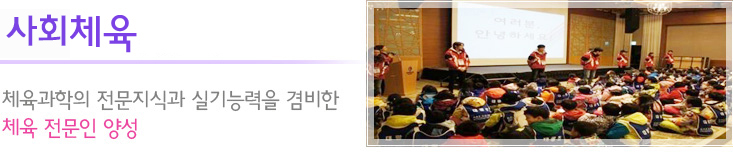국가와 산업사회 현장에서 요구하는 건전한 정신과 체력을 지닌 인재를 양성하고, 국민의 건강과 체력을 증진시키기 위해 체육 프로그램을 과학적이고 체계적인 방법으로 교육, 지도할 수 있는 체육 전문지도자 양성을 목표로 합니다