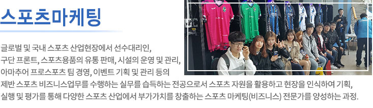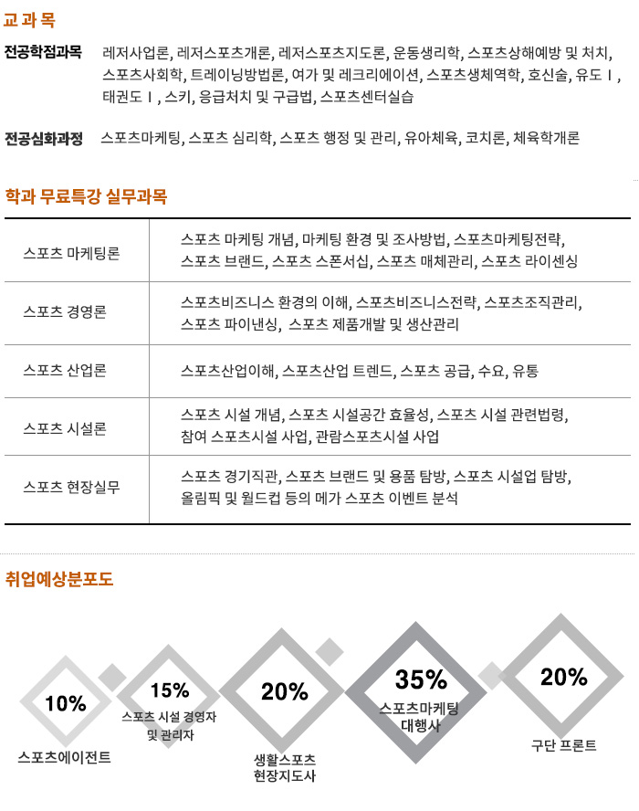 - 에이전트, 스포츠 에이전시, 프로스포츠 구단, 스포츠 마케팅 대행사, 스포츠 이벤트 매니저먼트, 스포츠 기록 대행사, 스포츠 시설업, 공공 생활체육센터, 스포츠 시설 관리자, 스포츠 용품 MD, 스포츠 프로퍼티 개발자, 대학원 진학 등