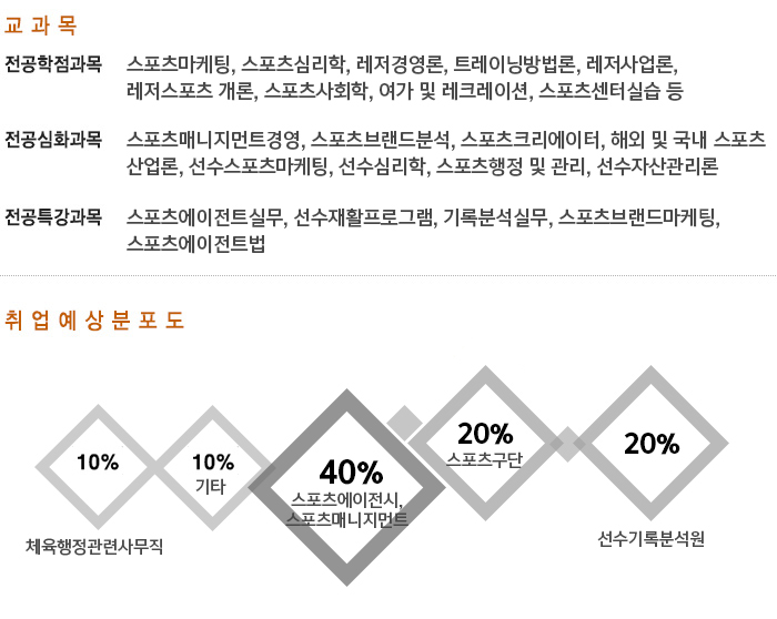 글로벌 및 국내 스포츠 산업현장에서 선수 에이전트, 매치 에이전트, 구단 에이전트 등의 제반 스포츠 비즈니스 업무를 수행하는 실무를 습득하는 전공으로서 스포츠의 마케팅과 스포츠를 통한 마케팅을 활용하여 선수인도스먼트, 구단계약, 선수발굴, 선수관리 등 다양한 업무를 기획 및 운영을 통해 다양한 부가가치를 창출하는 에이전트 전문가를 양성하고자 한다.