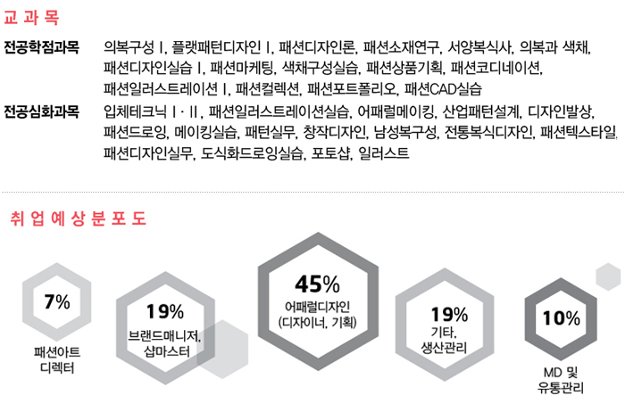 패션 디자이너, 패션테크니컬 디자이너, 패션 아트디렉터, 패션 저널리스트, 패션 에디터, 공연의상 디자이너, 패션 일러스트레이터, 패션 스타일리스트, 패션 모델리스트, 텍스타일 디자이너, 패션 머천다이저(MD), 패션 코디네이터, 브랜드매니저, 패션 샵 매니저, 패션 컬러리스트, 그레이더, 패션 바이어, 비쥬얼 머천다이저(VMD)