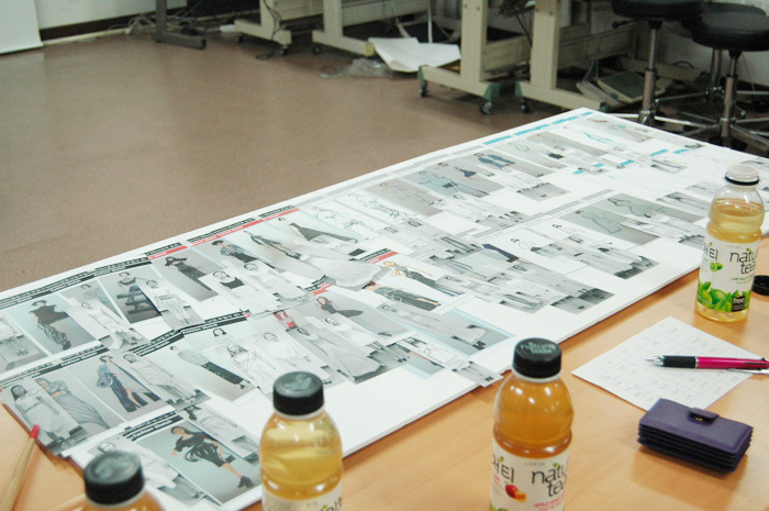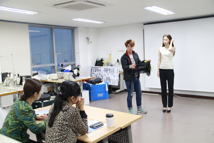 학생들의 작품들을 하나하나 보시며 핏은 물론 원단과 부자재에 대한 수정사항에 대해 상세히 체크해주셨습니다.