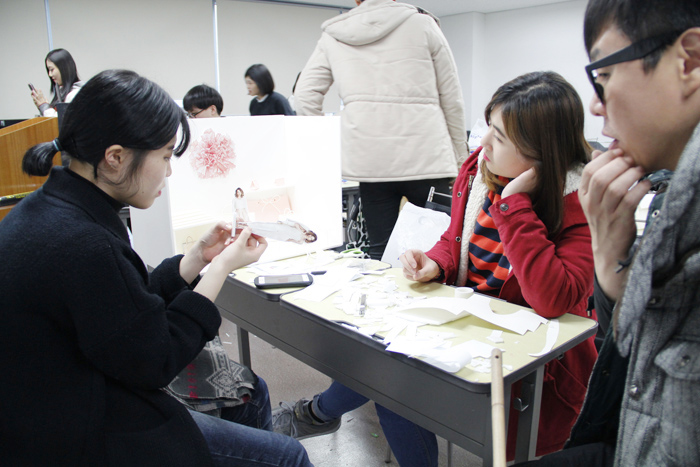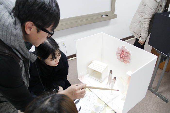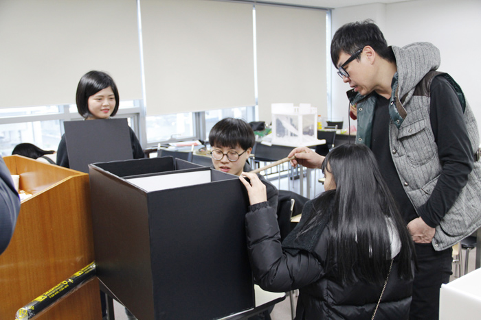 멋진 작품으로 완성시키기 위해 상세히 지도해주시는 이기오교수님과 그 부분을 놓치지 않기 위해 분주한 학생들!