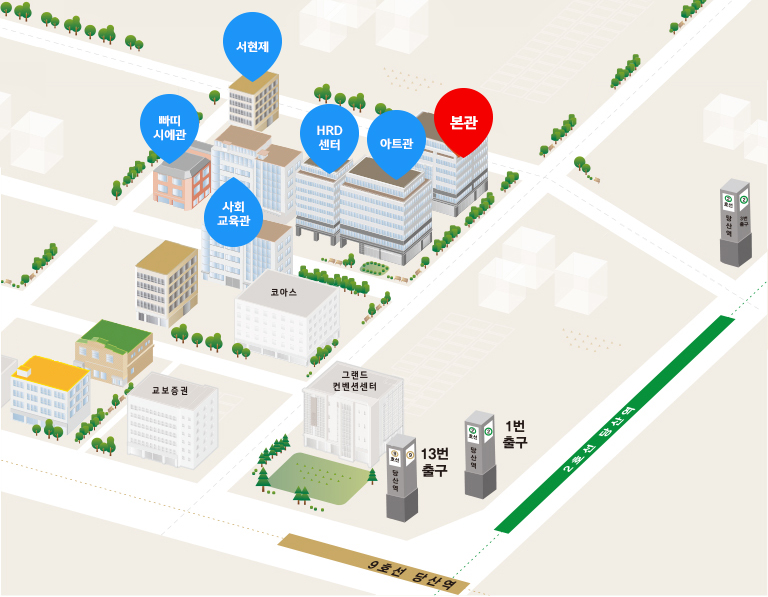 주요 대학들이 몰려 있고 젊은이들의 문화의 중심지인 홍대 근처에 위치해 있는 캠퍼스는 본관, 아트관, 빠티시에관, 사회교육관, HRD센터, 서현제로 구성되어 있으며 각 전공에 맞는 최적화된 실습실, 연구실에서 교수진들의 열정적인 강의와 학생들의 노력으로 목표와 꿈을 이룰 수 있는 무대가 되어 주고 있습니다.