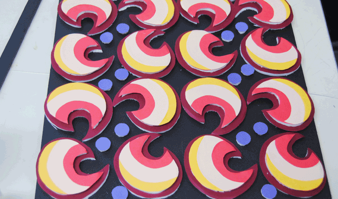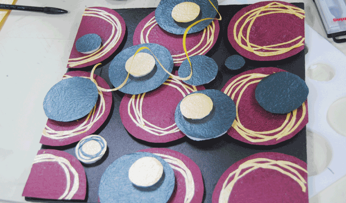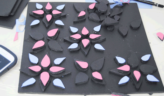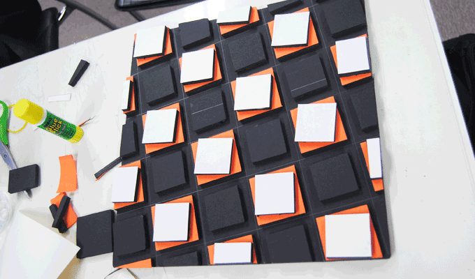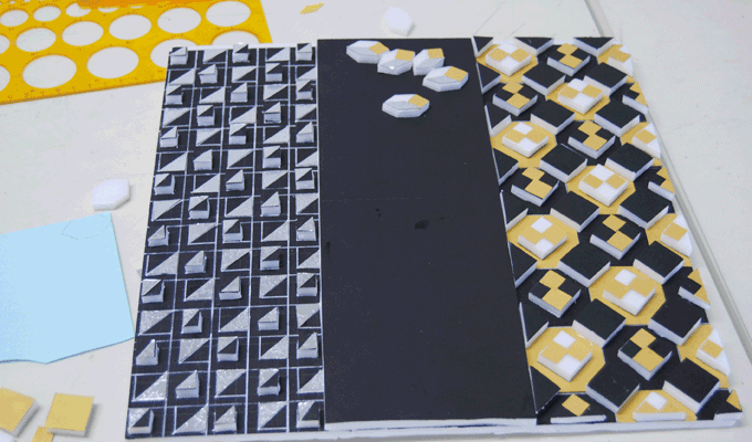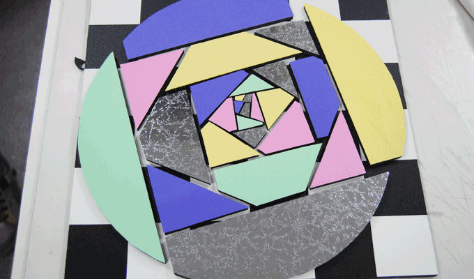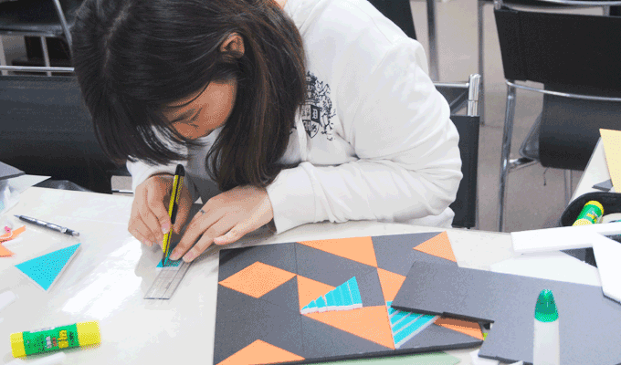 네모 판에 자신들이 생각하는 패턴들을 입혀보는 작업을 하며,색감과 공간적 감각을 키워내는 실습입니다.