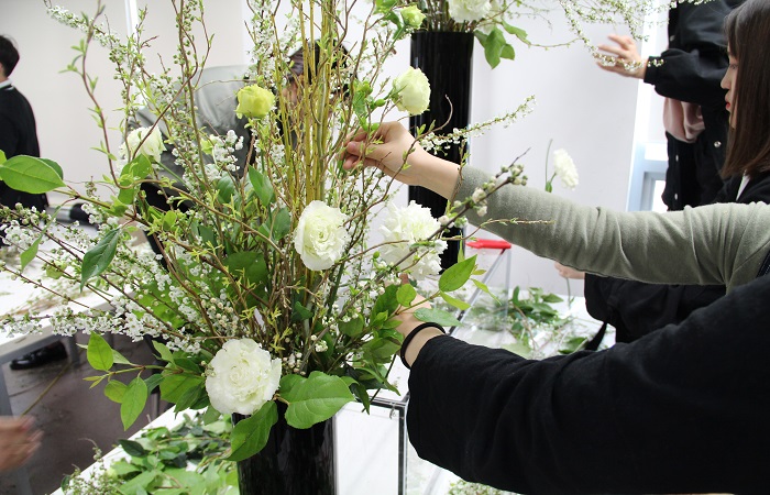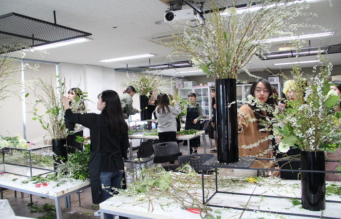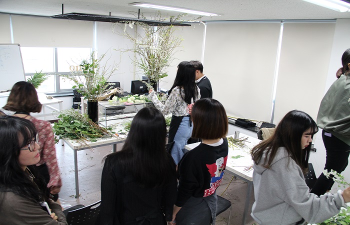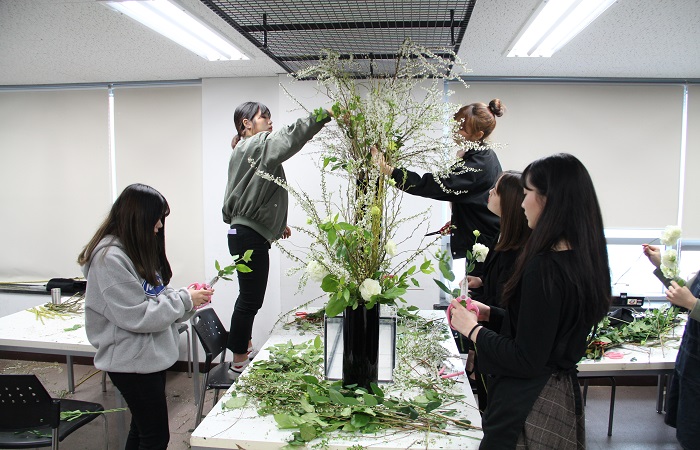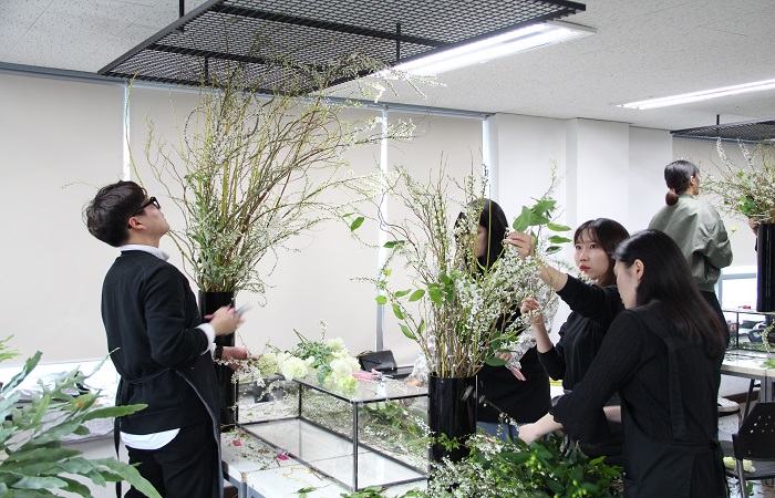 플라워디자인전공에서는 '봄'을 주제로 공간장식용 디스플레이 수업을 진행했습니다. 하늘거리는 설유화와 봄에만 피는 백매화를 활용하여 화이트와 블랙 컬러감으로 미니멀함과 자유로운 느낌을 연출했습니다. 학생들은 이 수업을 통해서 살아있는 컬러감을 표현하는 연출 능력을 배울 수 있었던 시간이었습니다.