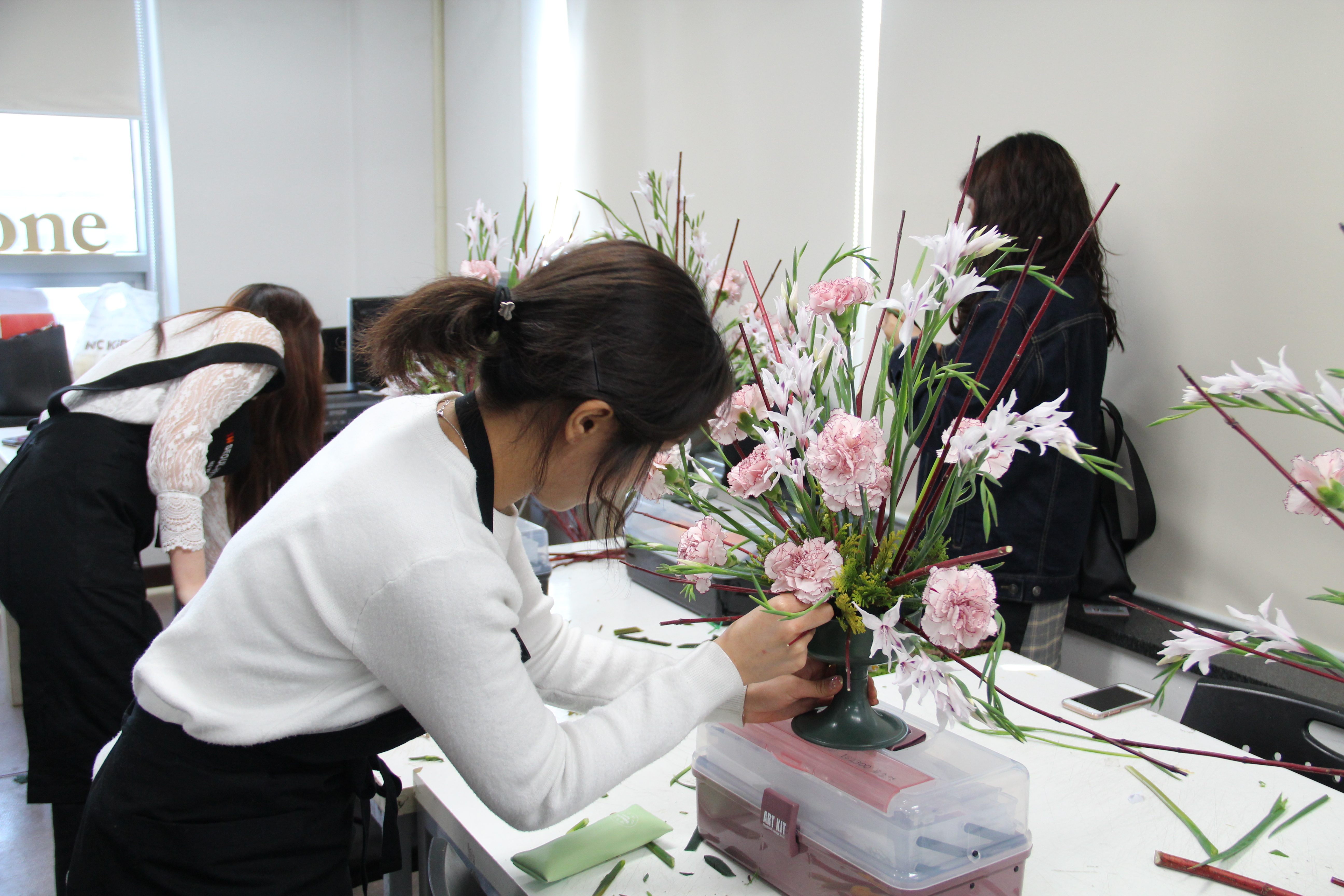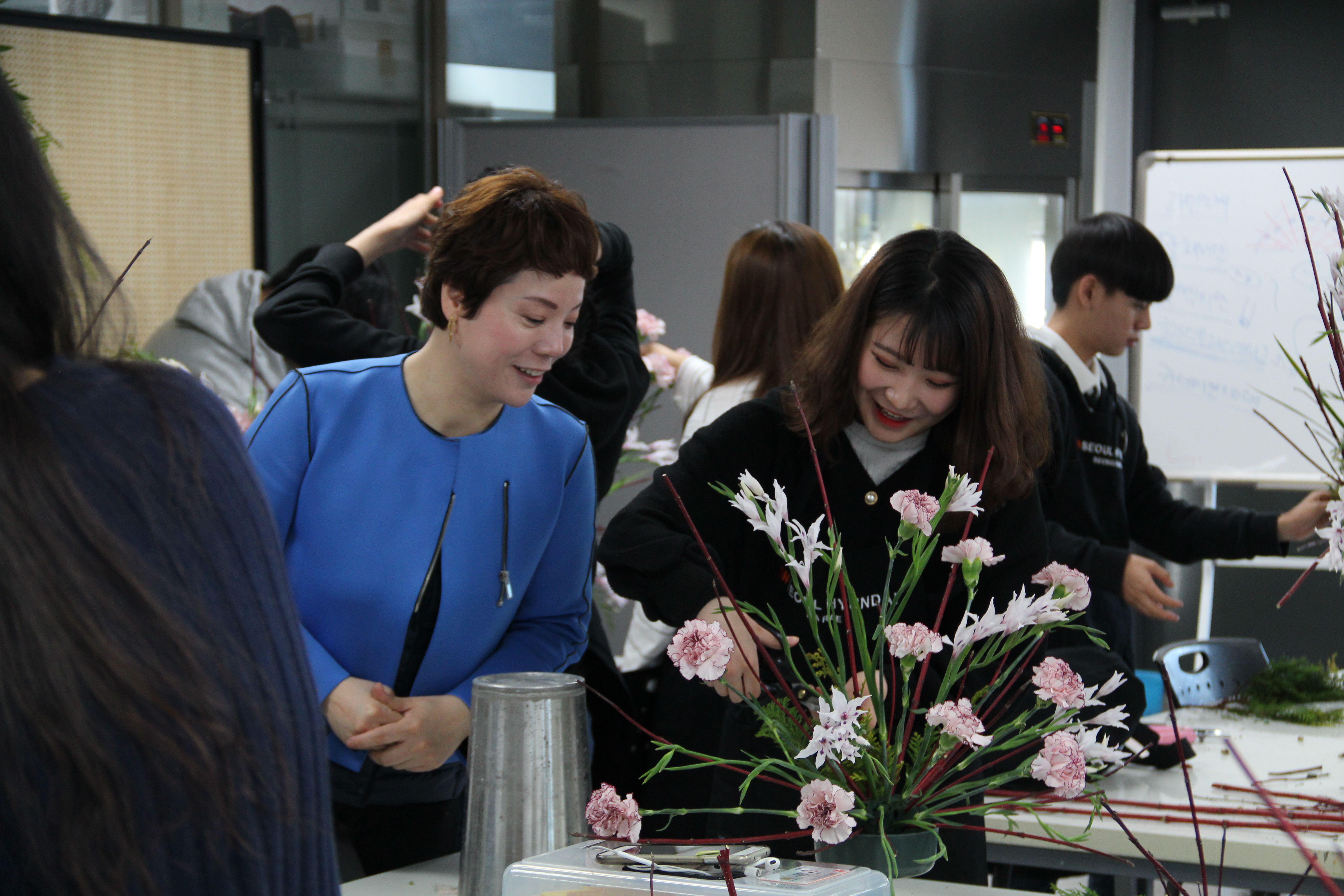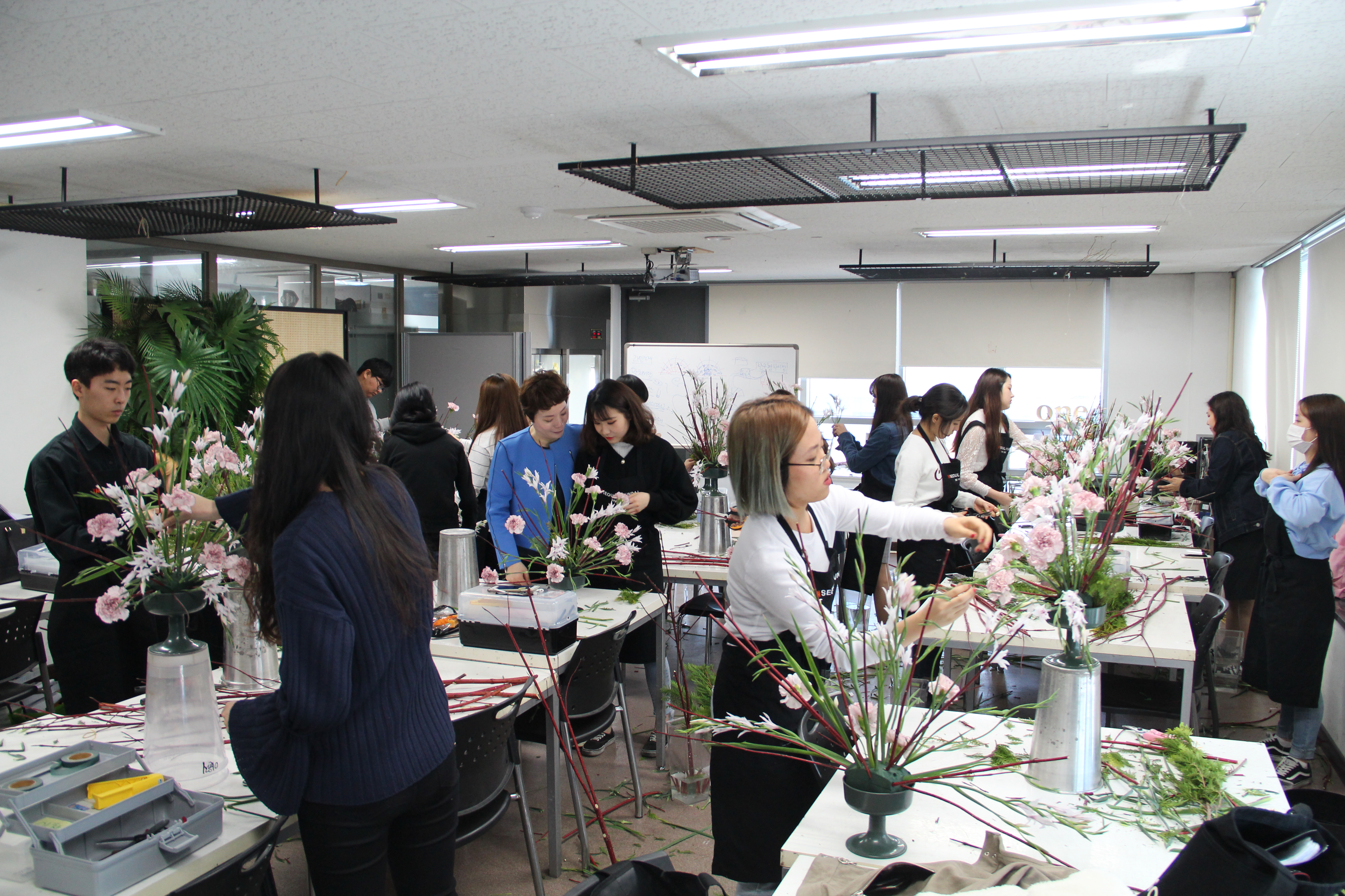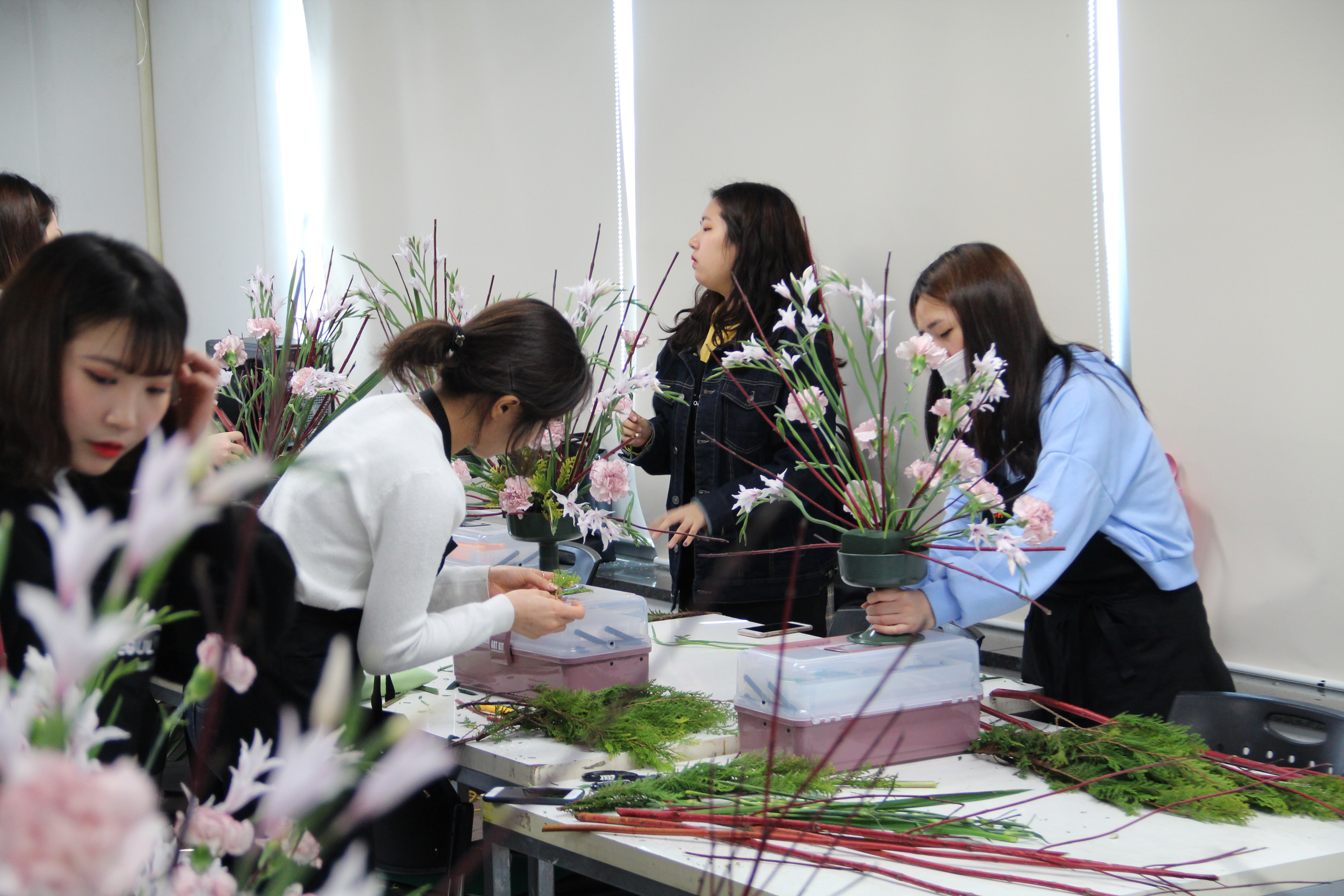 플라워 디자인 전공에서 대칭을 이루는 기본 부채형 디자인에 대한 수업이 진행되었는데요. 학생들이 수업에서 사용한 재료는 신종 글라디올러스, 카네이션, 말채, 측백으로 직접 실습에 나섰습니다.