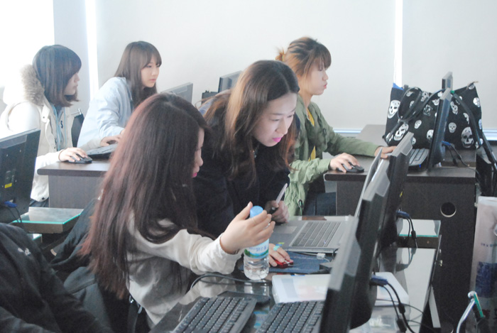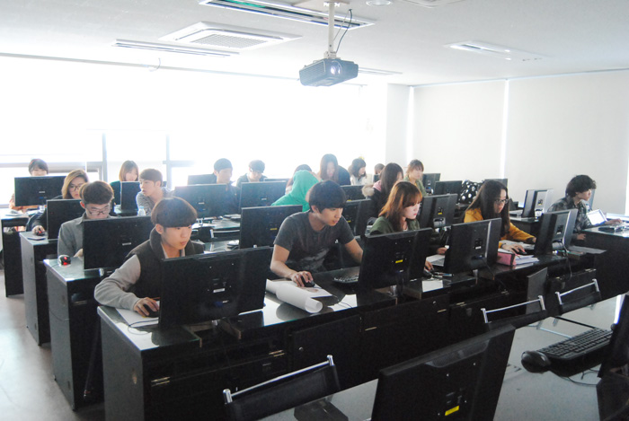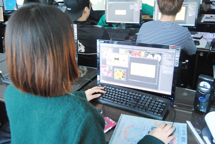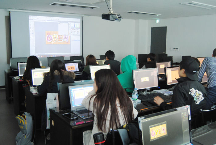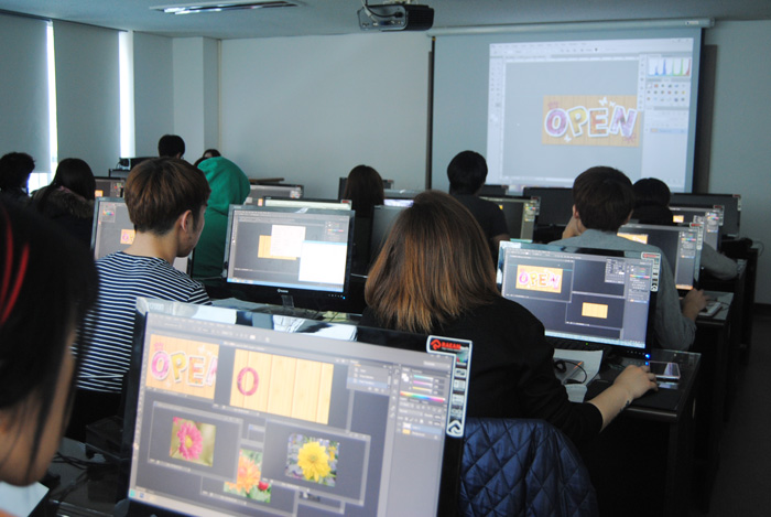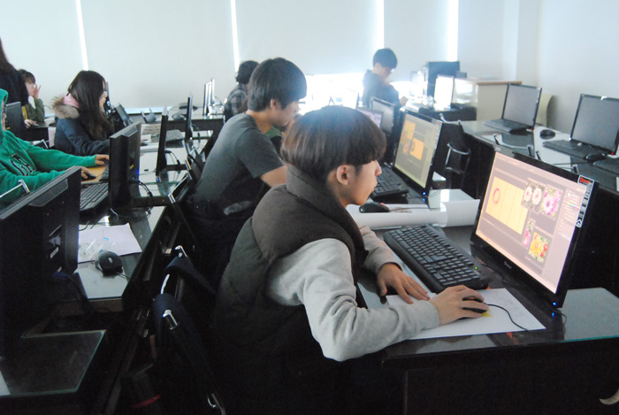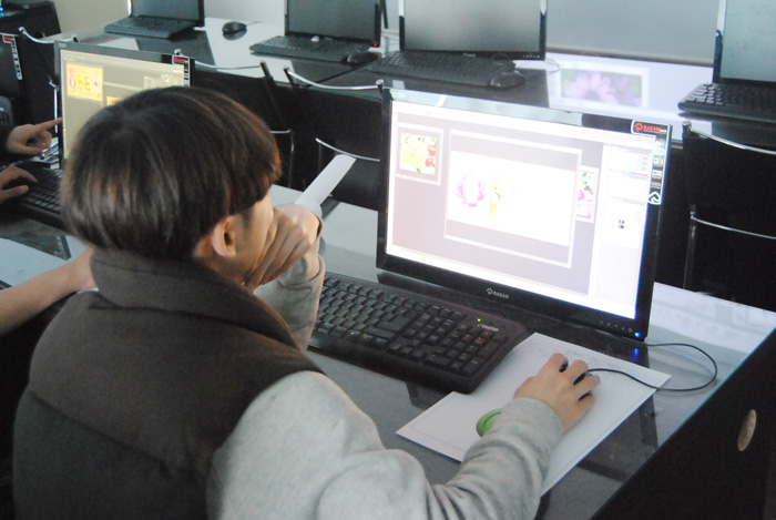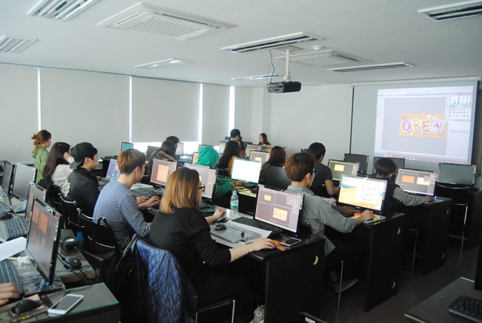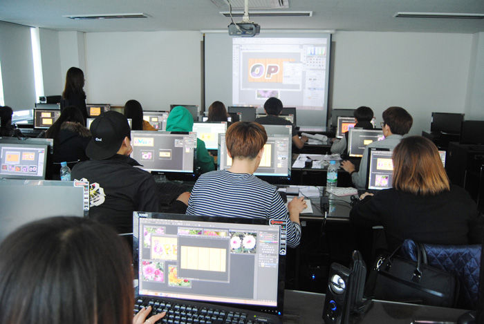 이제 막 입학한지 1달, 산업디자인전공 1학년 학생들은 포토샵 수업을 배우기에 열중하고 있다. 이 수업을 포토샵 기초를 배우는 수업으로 이날은 지난 시간의 과제를 제출하는 시간이면서 텍스테안에 이미지를 삽입하는 방법을 배우고 있다.