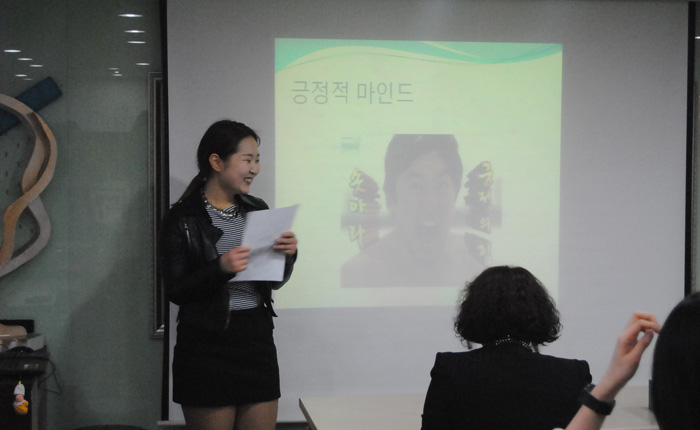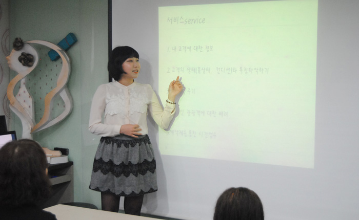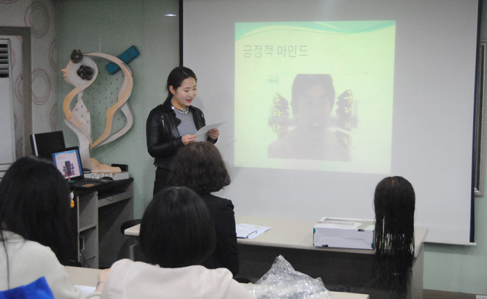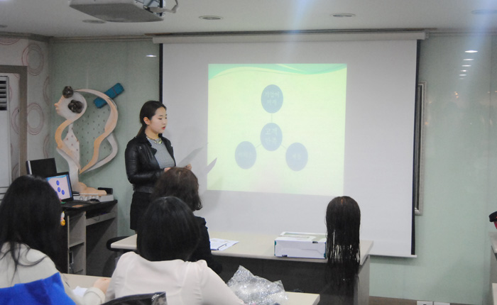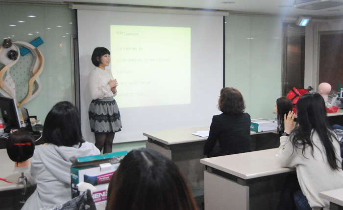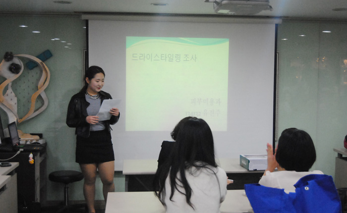 뷰티예술계열의" 헤어·드라이 기초" 수업시간에는 실기를 중심으로한 수업뿐만 아니라 5가지 주제를 통해 대학생 답게 사고를 열고 본인의 목표에 대한 구체적인 내용을 발표함으로써 목표와 앞으로의 계획을 정확하게 잡는데 중요한 핵심이 될 수 있도록 발표 수업을 진행하고 있다. 첫번째 발표자 유진주 학생은 긍정적인 마인드라느 주제로, 앞으로 뷰티분야에서 서비스부분에 대해서 어떻게할 것인지에 대해 발표했다. 두번째 발표자 서보은 학생은 자신의 방과후와 방학동안 경험한 현장에 대해서 알게된 정보 공유와 느낀점을 얘기하며 전문지식과 교육이야 말로 놓쳐서는 안될 부분이라고 발표했다. - 뷰티예술계열 공통 - 외식산업관 501호 |