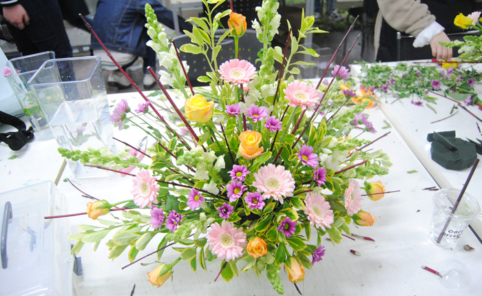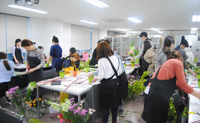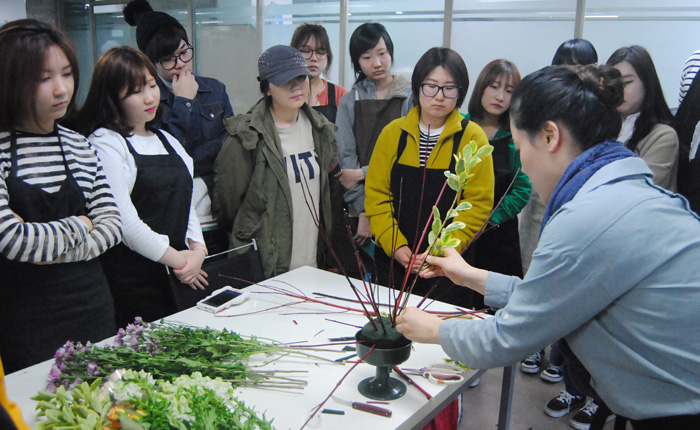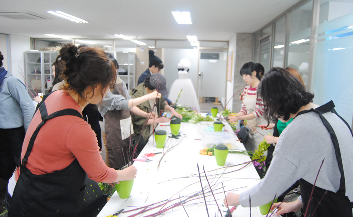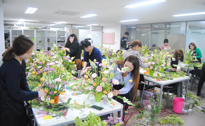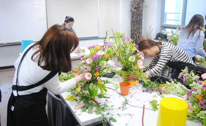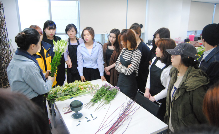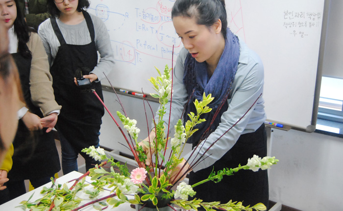 오늘의 수업시간은 기본 부채형을 이용한 플라워디자인 수업이다. 교수님의 데모를 보여 가르침을 받은 후 학생들의 실습이 이어졌고, 학생들의 작품이 완성 후에는 한명씩 작품을 앞으로 들고 나와 다같이 살펴보며 작품 평가의 시간을 가졌다.