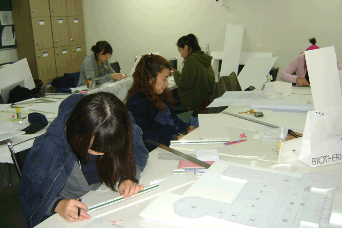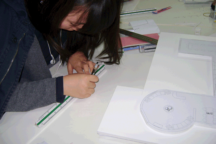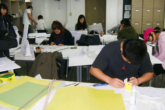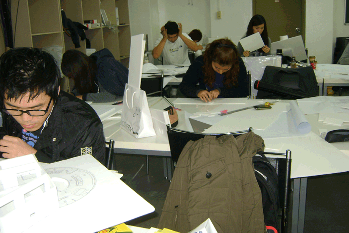 신일심교수님의 지도하에 2학년 포트폴리오수업으로 졸업작품에 전시를 위한 개별 모델링작업중인 모습입니다. 각자의 프로젝트 컨셉에 맞는 도면을 완성하고 그에 따른 모델링작업을 신중하게 진행하고 있습니다. |